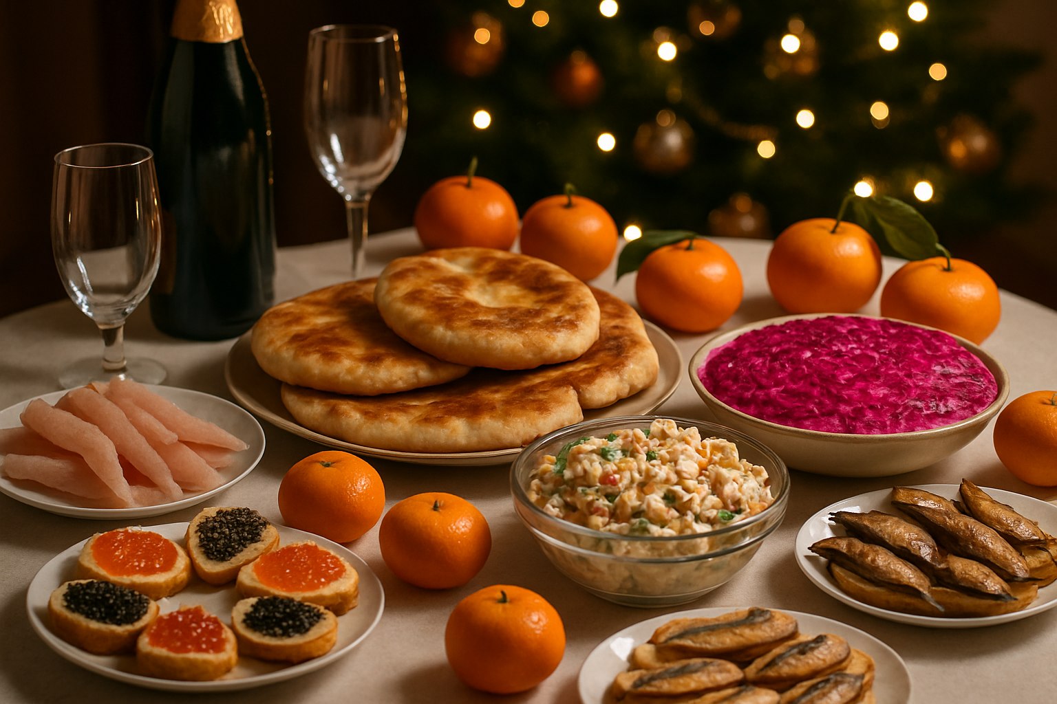 Новогодний стол в России — это буквально кулинарная карта страны: от строганины на Севере до чак-чака в Поволжье, от уральских посикунчиков до бурятских бууз с 33 защипами. Кавказ удивляет галушками с мясом — жижиг-галнаш — и пирогами чуду, казаки — наваристой ухой из нескольких видов рыбы, Дальний Восток — маринованной рыбой тала и салатом из морской капусты с крабом.
